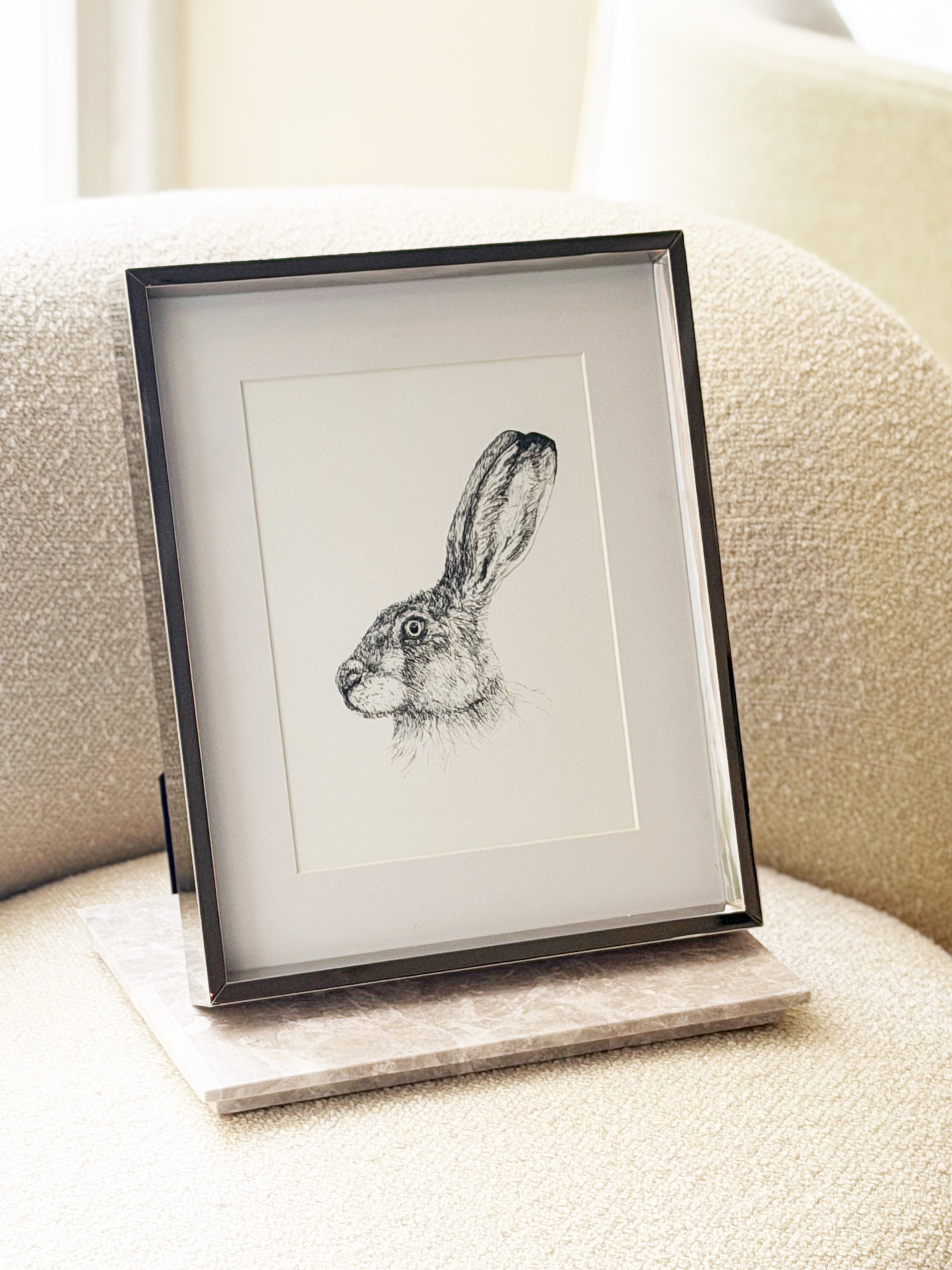 Dieser silberne Bilderrahmen mit Passepartout zeigt eine feine Hasen-Büste, reduziert & voller Charme.
