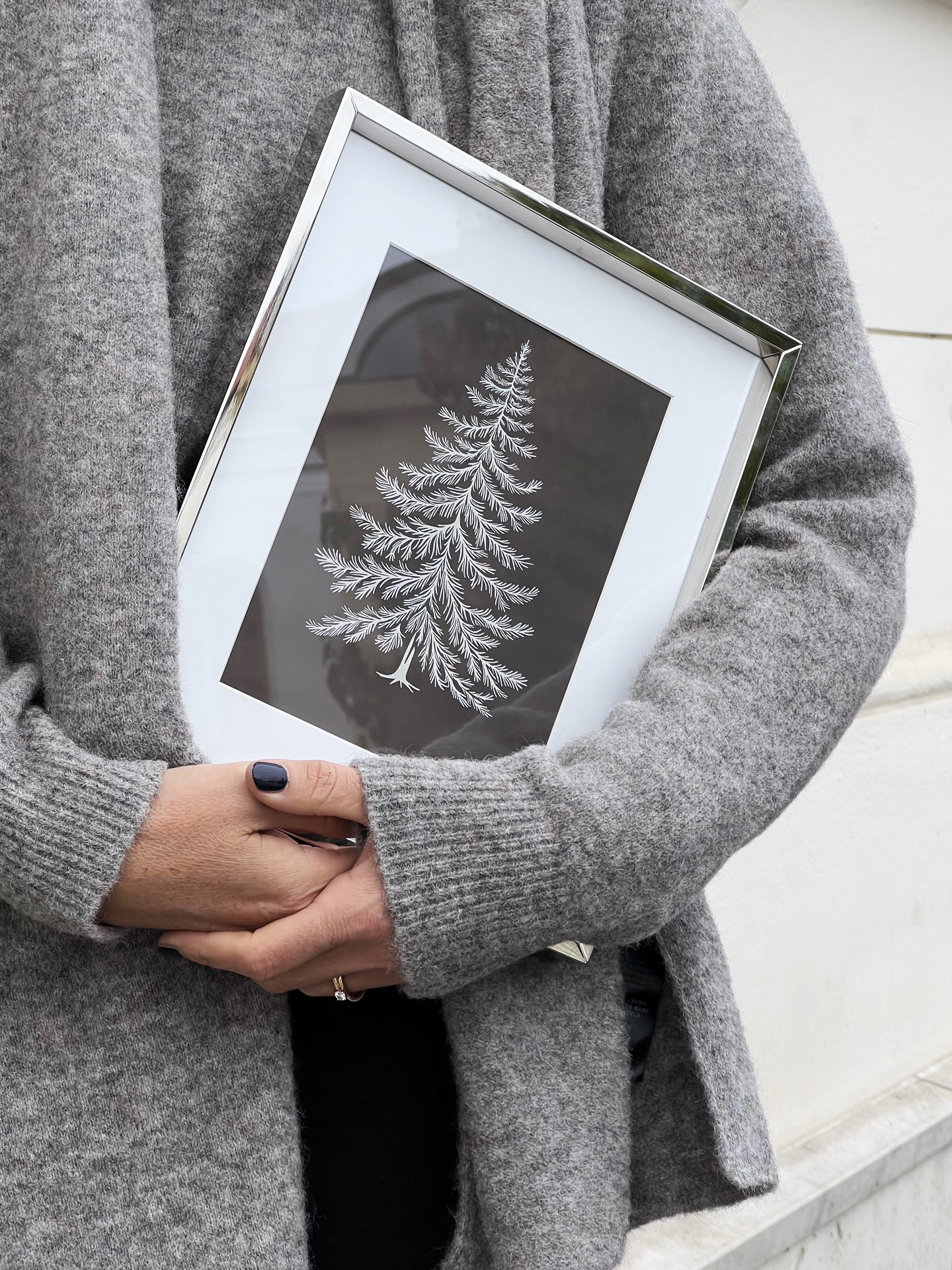 Der versilberte Bilderrahmen mit dem zart gezeichneten Tannenbaum auf moccafarbenem Hintergrund bringt sanfte Eleganz und warme Zurückhaltung in dein Zuhause.