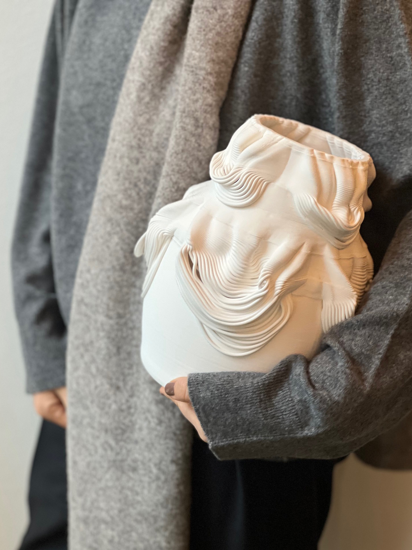 Die Drisca-Vase vereint eine traditionelle Form mit 3D-gedruckter Keramik und zeugt von innovativer Handwerkskunst. Ihre unglasierte, matte Oberfläche betont die Haptik des Materials, während bandartige Muster an fließende Stoffe erinnern.
