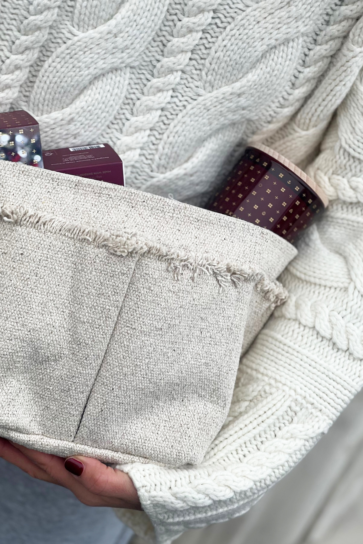 Die ausgefransten Kanten an der Außenseite der Tasche sorgen für ein Detail zum Anfühlen. Dieser weiche Artikel verstaut auf ordentliche Weise alle kreative Unordnung und Alltagsgegenstände.