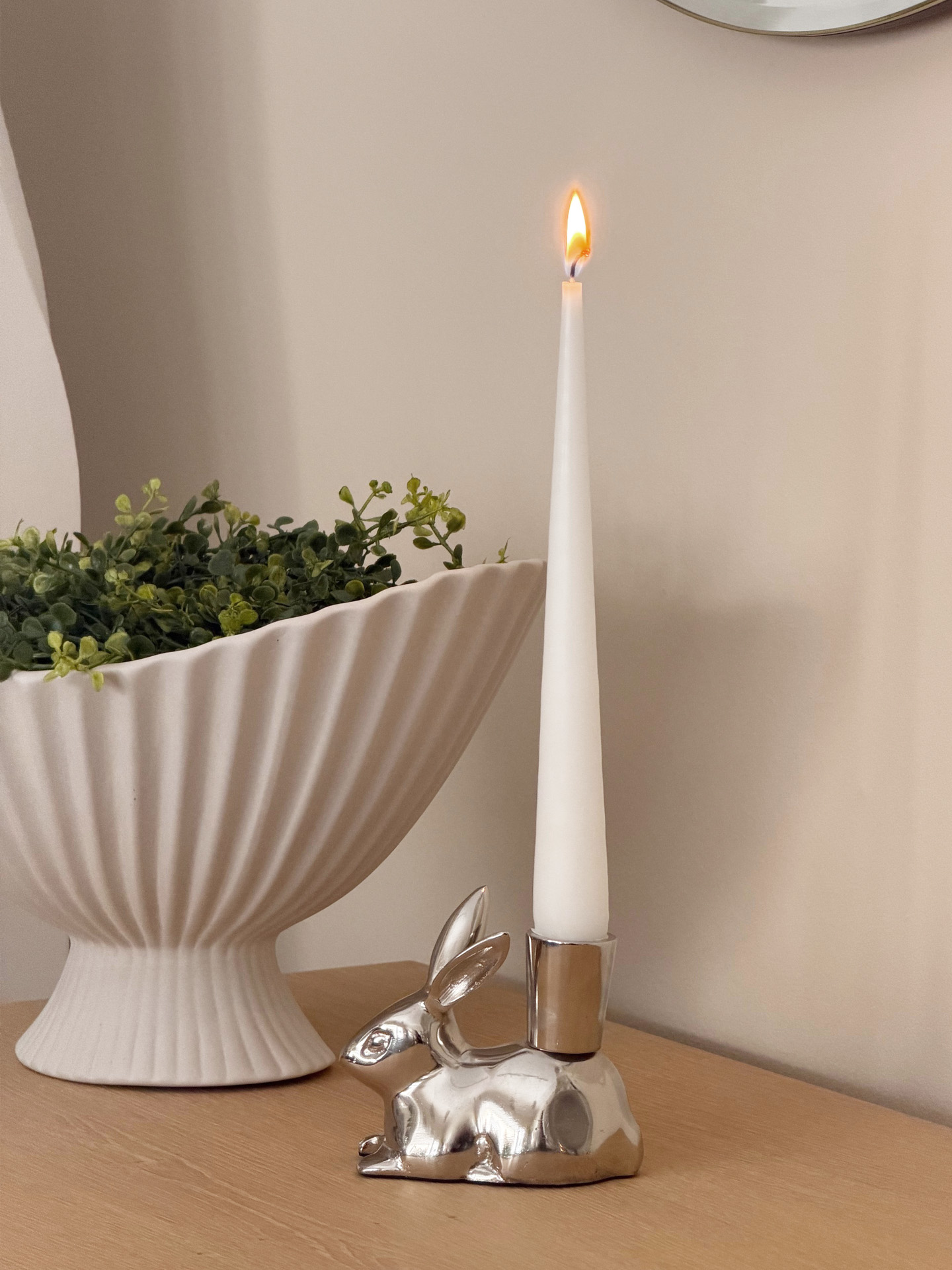 Das glänzende Silber reflektiert das Kerzenlicht auf besondere Weise und setzt einen edlen Akzent auf Tisch, Sideboard oder Ostertafel. Der Hase wirkt dabei nicht kitschig, sondern ruhig und hochwertig, ganz im nordischen Stil.