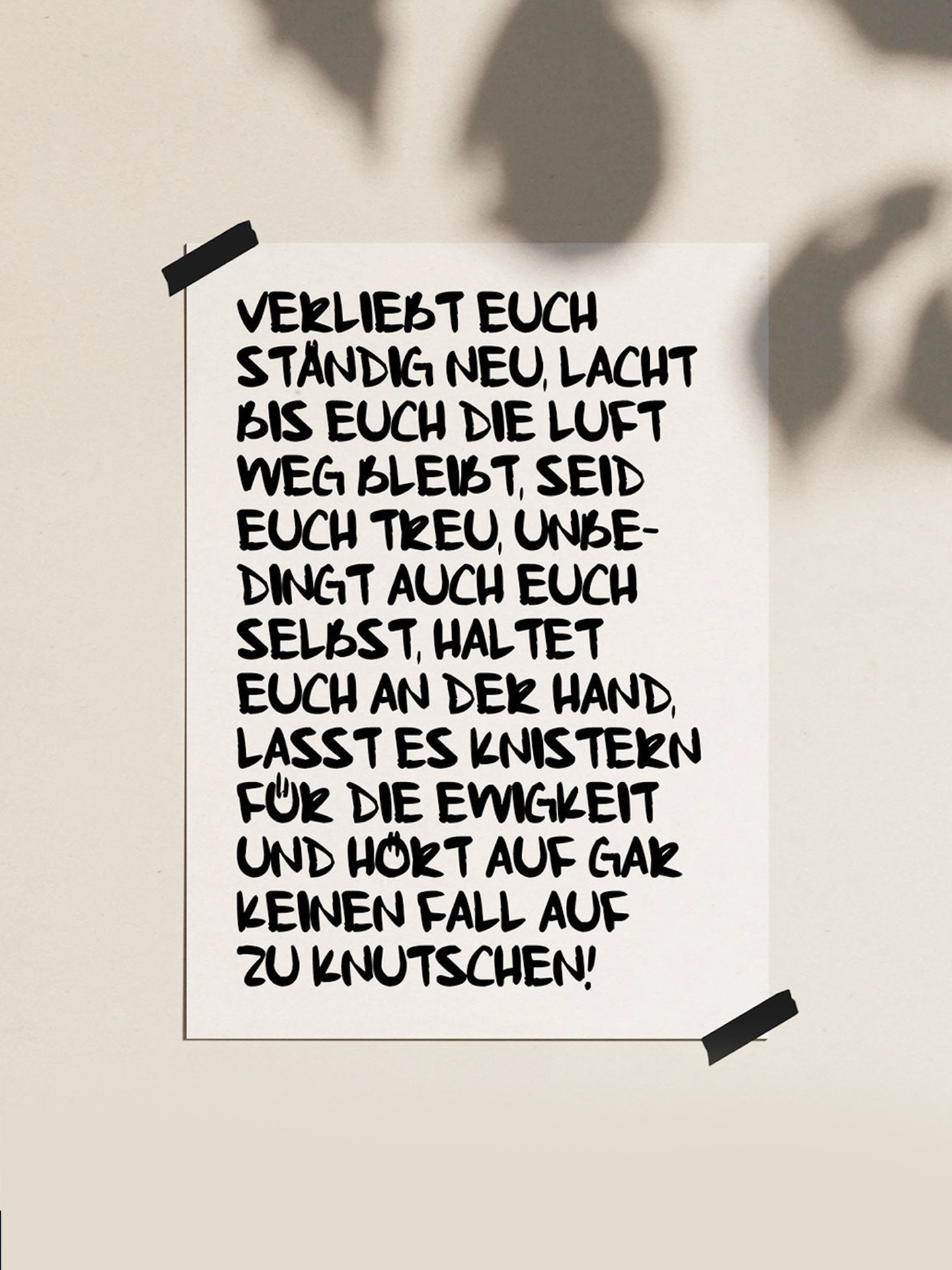 Verliebt euch ständig neu, lacht bis euch die Lust weg bleibt, seid euch treu, unbedingt auch euch selbst, haltet euch an der Hand, lasst es knistern für die Ewigkeit und hört auf gar keinen Fall auf zu Knutschen.
