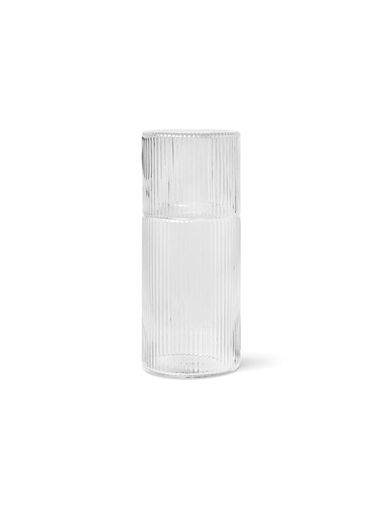 Bleib‘ gesund mit genügend Wasser und diesem handlichen Set aus einer kleinen Karaffe und einem Glas, das auch als Deckel verwendet werden kann. Das Set hat die Charakteristika der Serie mit dem geriffelten mundgeblasenen Glas. Es könnte das neue gesunde Bürozubehör sein oder ein neuer Favorit für den Nachttisch.