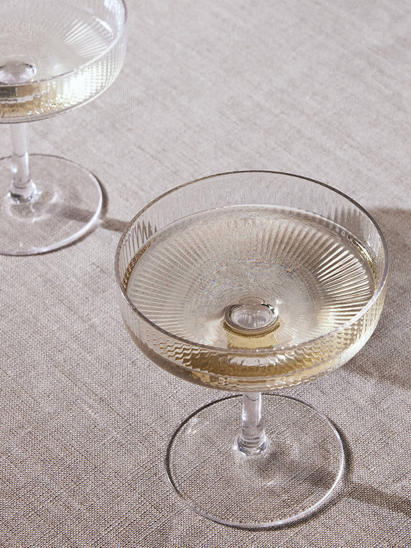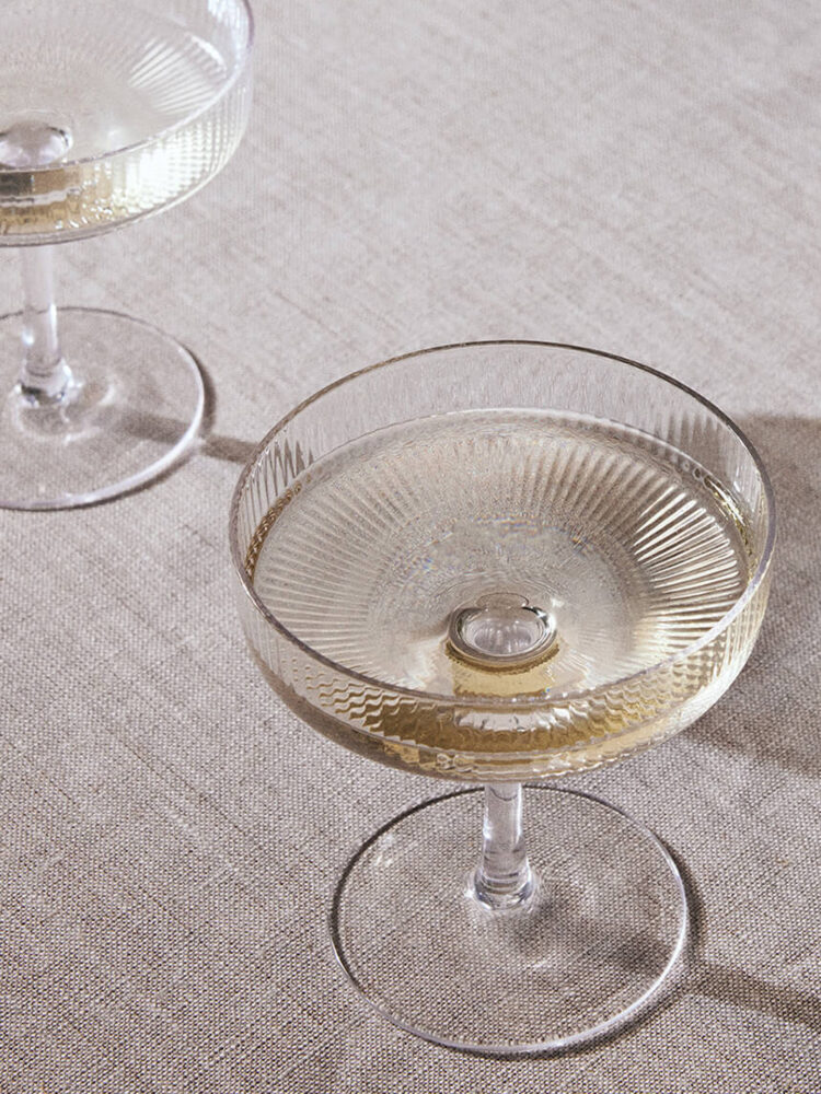 Die Ripple Champagnergläser, mit ihrer wunderschön geriffelten Oberfläche von FERM LIVING, sind klassische Schaumweingläser. Der dynamische und elegante Ausdruck der Gläser wird erzeugt, indem empfindliches Glas von Mund in Formen geblasen wird. Besondere, elegante Gläser für besondere Anlässe.