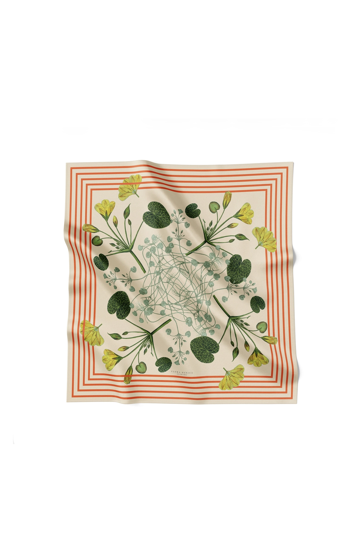 Der Candy Striped Blossom ist ein quadratischer Seidenschal in wunderschönen Farben. Die florale Illustration ist inspiriert von Flora Danicas Darstellung des Gelben Schwimmherzens (Nymphoides peltata) und wird von feinen orange-roten Streifen umrahmt. Mit seinen Maßen von 53×53 cm eignet sich der Schal sowohl um den Hals als auch als dekoratives Haarband oder auch als besonderes Detail auf deiner Tasche.