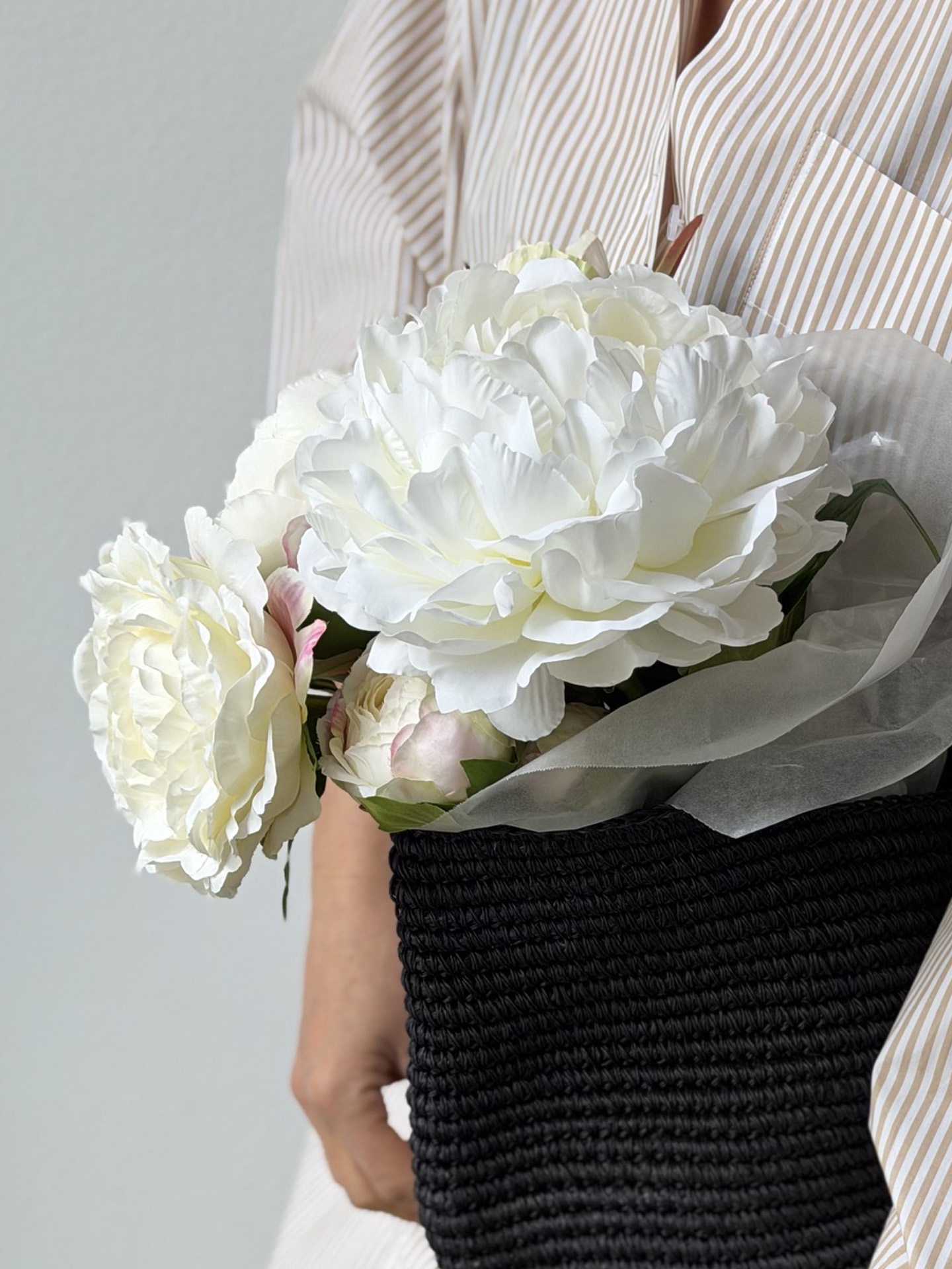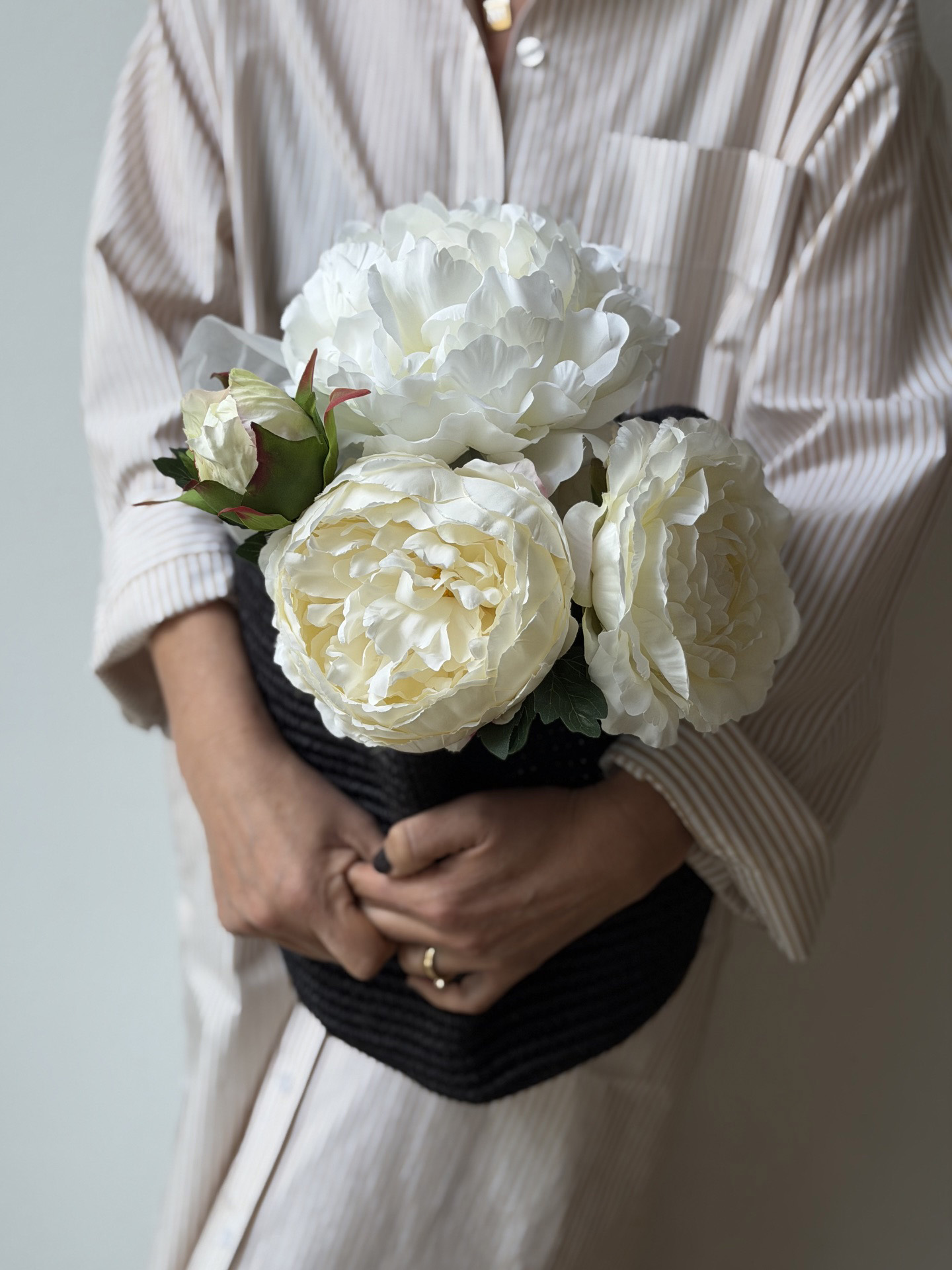 Schlicht. Hell. Zeitlos. Nordic Blanche kombiniert drei weiße Pfingstrosen aus feinster Seide zu einem ruhigen, eleganten Arrangement.