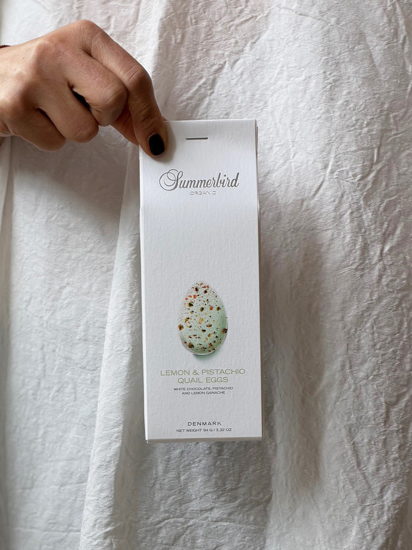 Die köstlichen Wachteleier Praliné von SUMMERBIRD bestehen aus einer raffinierten Weiße Schokolade, Pistazien- & Zitronen-Ganache.